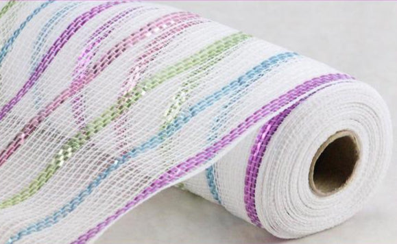 Use this poly/jute matte stripe mesh to bring your next wreath creation over the top! This versatile mesh is easily adaptable to any display you see fit; colored in white, with a light pink, sage, turquoise and lavender stripe pattern, it will undoubtedly look stylish in any scenario! Add this mesh to a work wreath, garlands, swags, or even trees to wrap your home decor in style! Be sure to pair your mesh with a variety of ribbon and colorful tubing to show off your creative ingenuity!