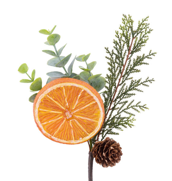 Freshen up your holiday decor with a slice of citrus delight! This orange slice and pinecone pick comes with a handful of green leaves that add to the natural and earthy aesthetic. Make your trees, wreaths and planters come to life this holiday by adding a bit of fruity flavor!10" ORANGE SLICE MINI PINECONE PICK
