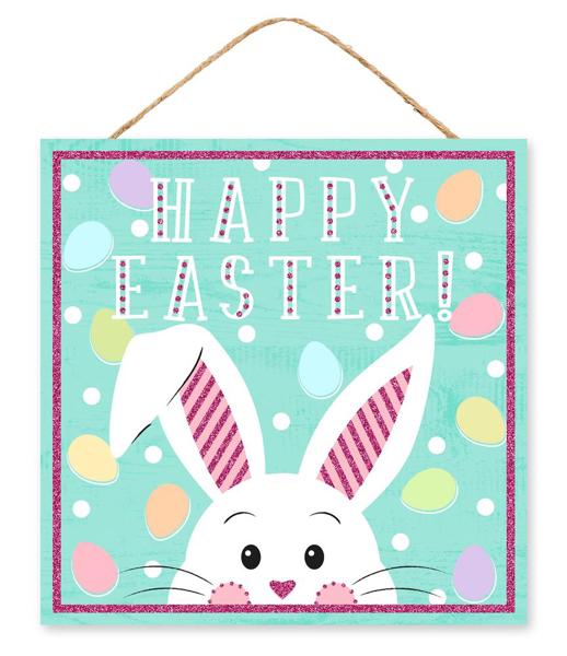 Celebrate the Easter season with this darling Happy Easter glitter sign! This sign includes an eager Easter bunny set against a background of pastel eggs, with glitter accents throughout to make this sign shine! Whether this sign act as a standalone decoration or within a wreath display, it is sure to turn some heads this holiday season!