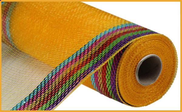 This 10" x 10yd Border Stripe Metallic Mesh features a yellow color with multi-colored edges.