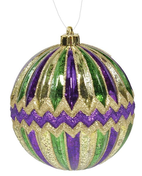 For a stylish Mardi Gras display that will last through the ages, include this antique look stripe chevron ball! This ball features purple, emerald green and gold stripes and a chevron pattern throughout, along with an antique finish that will pair nicely with any decor! Hang this ball in a string of garland, in a seasonal wreath, or, of course, from the Christmas tree itself! This ball will look marvelous when hung in a wreath display, or used alongside some themed masks, picks, or sprays!