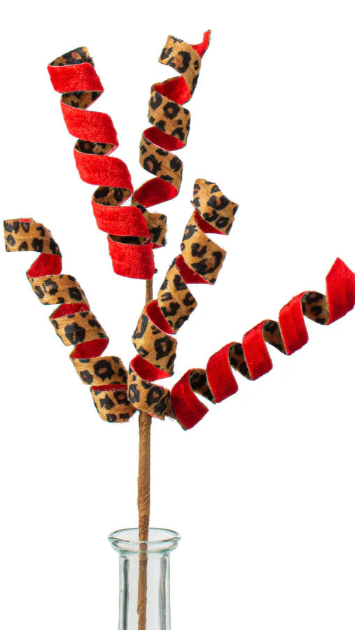 The 16" Double Sided Frizzy Curly Pick in Cheetah & Red offers a fun twist with its solid red velvet on one side and cheetah print on the other. The wired curls can expand from 5" to 8" in height and the fabric is approximately 0.5" wide, with a wired stem wrapped in brown paper.