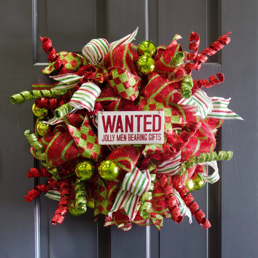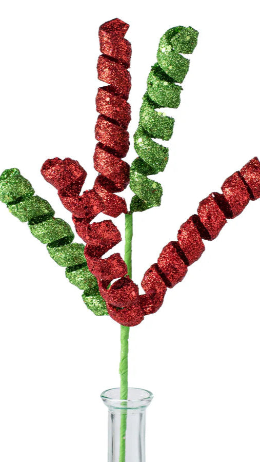 A metallic, glittered curl spray with red and lime green wired arms. Five adjustable wired arms. Green wire base. Great Christmas accent spray.