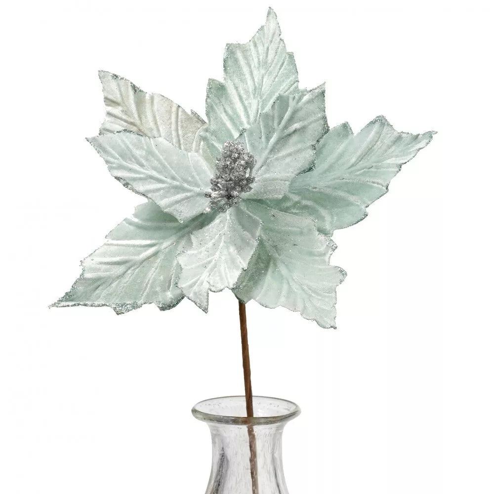 Elegant velvet poinsettia in pale blue. Wired petals can be shaped and glittery center adds elegance. Suitable for Christmas trees. Glitter accents and available in various colors. Measures 11" in diameter with an 18" wired stem.