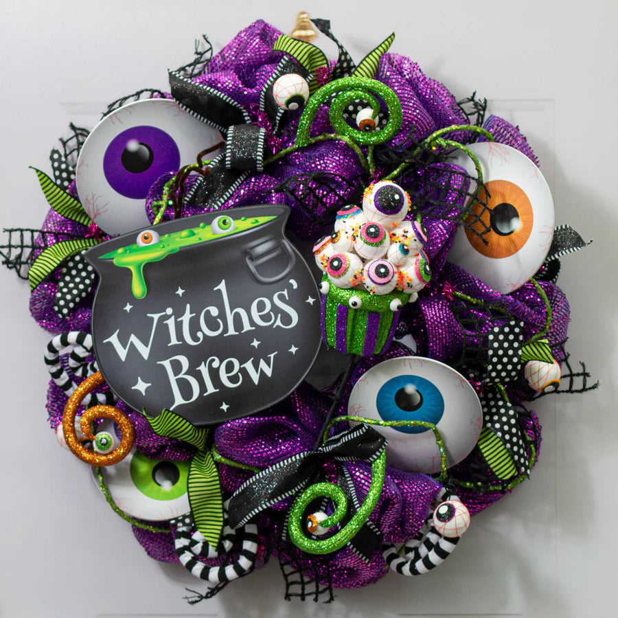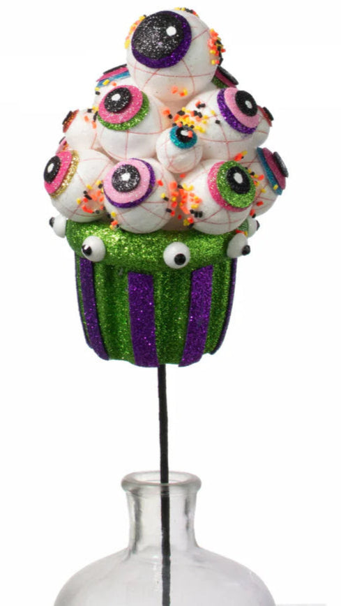A Halloween cupcake with a glittered green cup, purple glittered stripes, and various sizes and colors of eyeballs as toppings. Decorated with orange, black, and yellow sprinkles, it measures 7.5" tall and 5.25" in diameter. The foam is wrapped in black paper and has a wired stem.