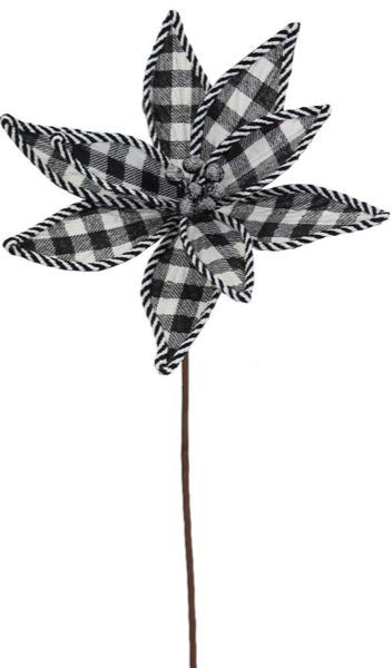 19.5"L Velvet/Plaid Poinsettia Stem: Black & White