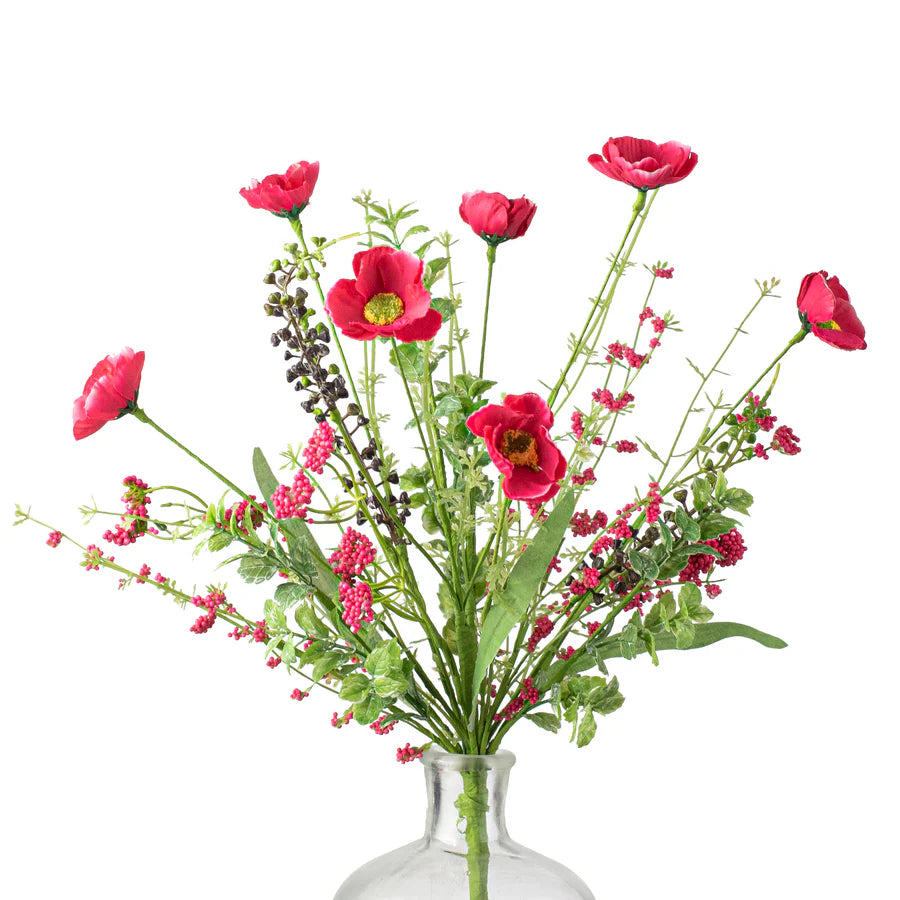 Introduce vibrant color into your decor with our 21" Poppy Flower Spray. This fuchsia pink beauty features lifelike silk petals and wild foliage, complemented by pink berries and vines. Standing at 12.5" tall, its wired stem is easily shaped, while its silk poppies, 1.5"-2" in diameter, can be steamed to open fully.