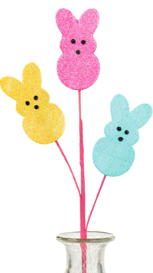 Hop right into holiday decorating when you use this glitter bunny spray! This spray is the perfect addition to your Easter decor; featuring three bunnies, colored in pink, yellow and turquoise glitter, allowing them to fit with a wide variety of pastel colors! Use these bunnies alongside other Easter-themed enhancements, like colored eggs, and other fun picks or sprays! Add them to a wreath outfitted with ribbon, mesh and tubing to really show your creative potential!