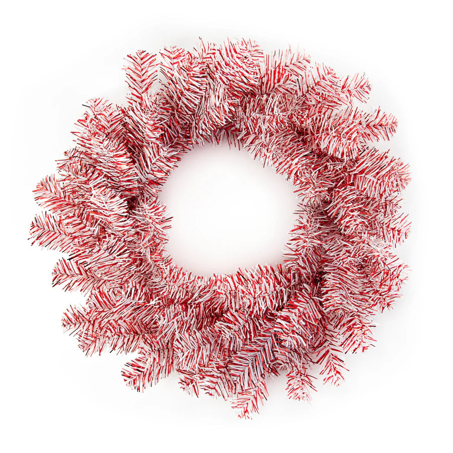 This PVC pine wreath features a unique blend of matte white and metallic red tinsel on each sprig, reminiscent of candy canes or peppermints. Perfect for adding a festive touch to any holiday decor, it has a maximum outer diameter of 24" with a sturdy wire frame measuring 14" in diameter and 6" in depth. Ideal for both elf-themed and traditional ornament displays