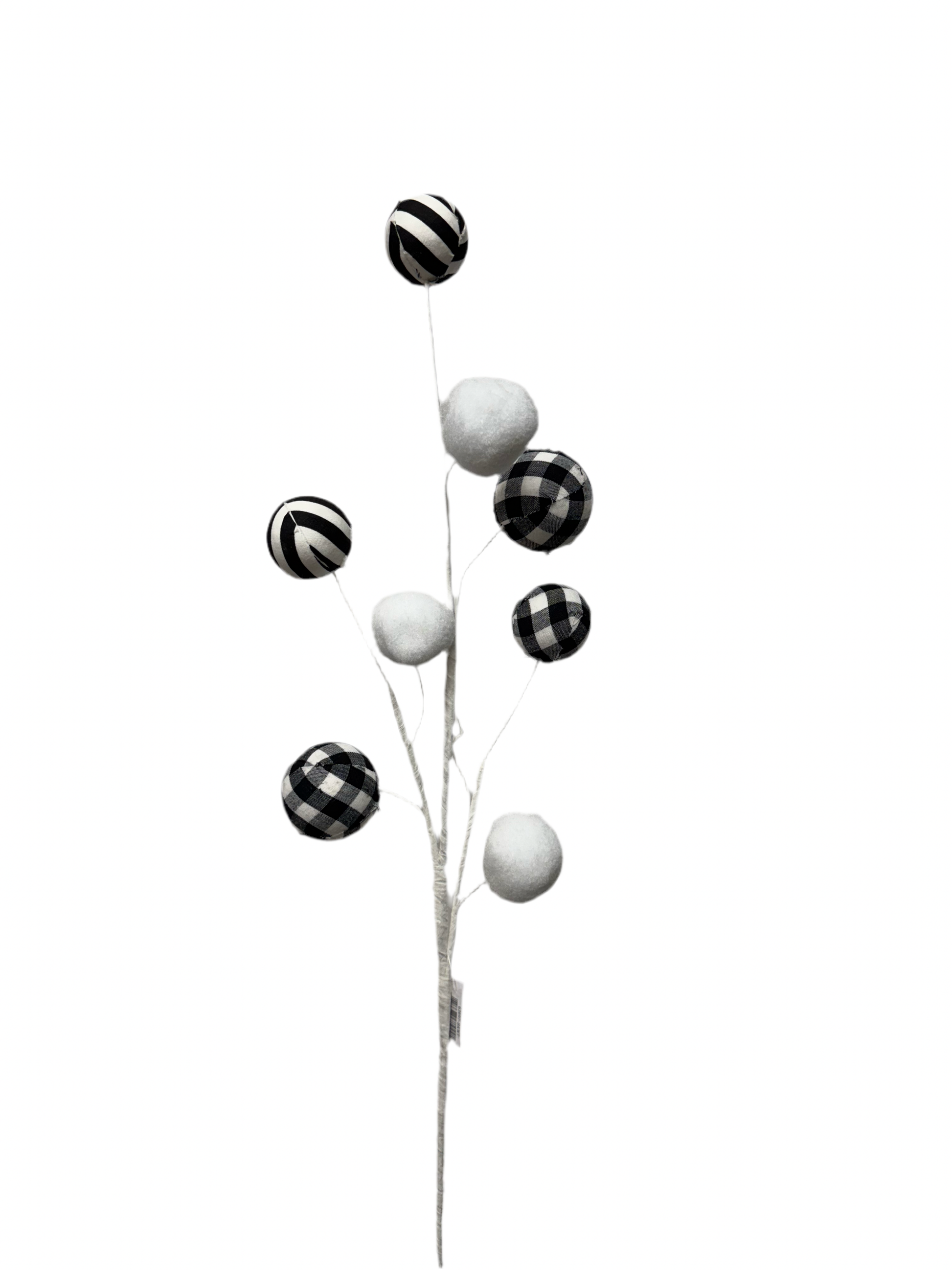 Spruce up your décor with our 29" Ball Spray Blk/Wht. This playful spray features 9 different balls on a 29" black and white stem, perfect for adding a unique touch to wreaths or trees.