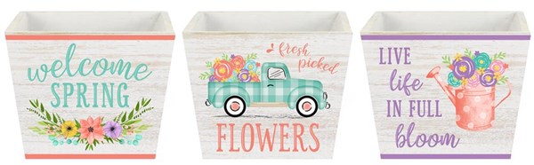 Use these marvelous Spring planters to enhance your seasonal decor! These planters feature three unique designs, all of which include bright flowers, allowing them to mix perfectly with your Spring decor, like bushes, creative sprays and picks! These planters will look marvelous in a stacked planter display, or even used on a ledge or mantle!