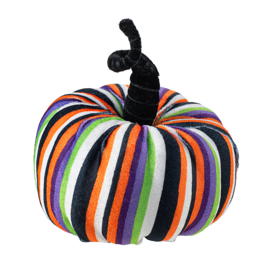 This 6" fabricated Halloween pumpkin boasts a charmingly asymmetrical shape, wrapped in a colorful pattern of purple, green, orange, and white stripes. Its twisted stem is elegantly bound in black velvet and adds an additional 0.5" height to its overall 6.5" stature. The foam material is wrapped in fabric and features a unique wired stem.