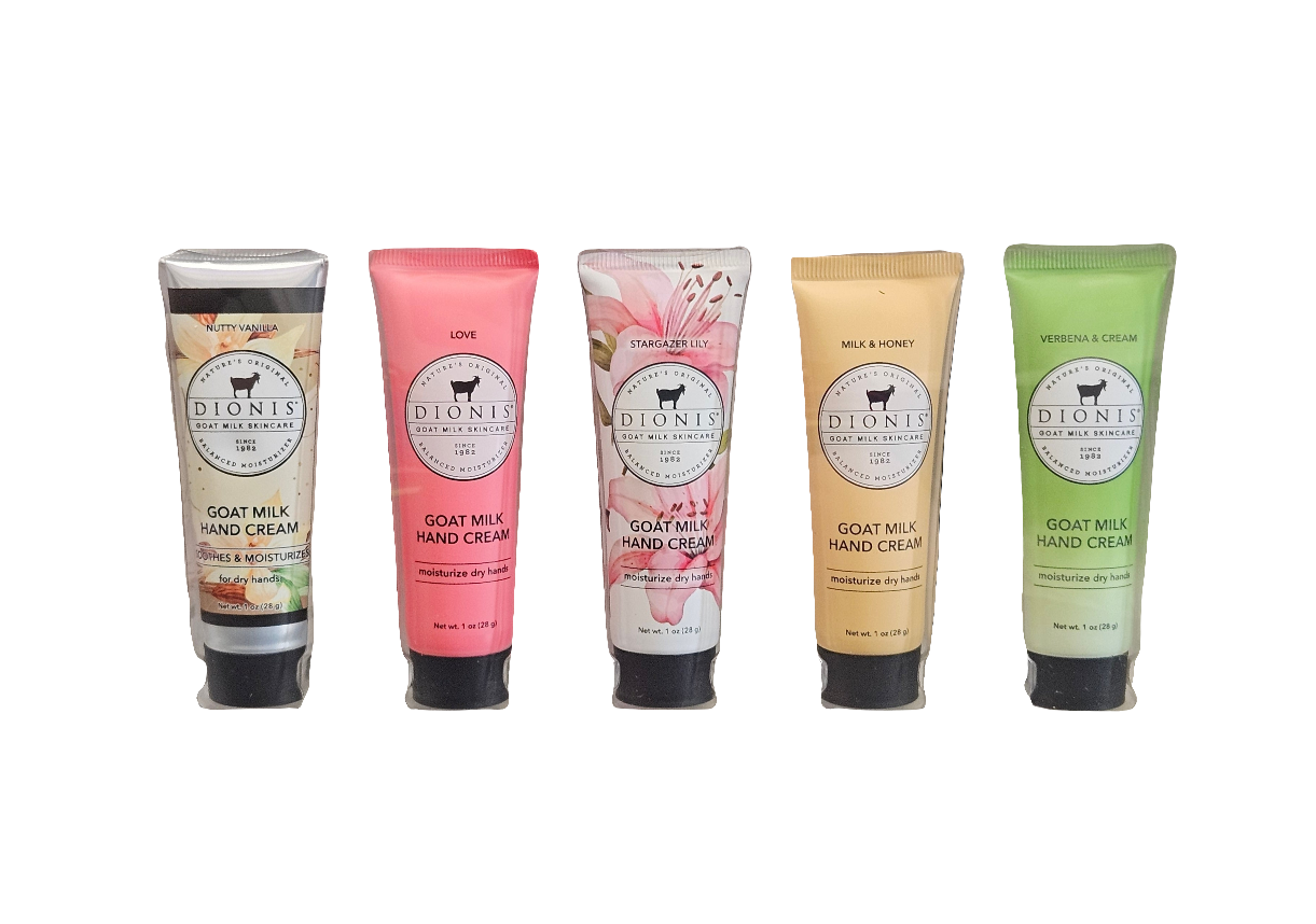 Dionis Goat Milk hand cream gift set with five unique 1oz options. Scents include: Nutty Vanilla, Love, Stargazer Lilly, Milk and Honey, Verbena and Cream.
