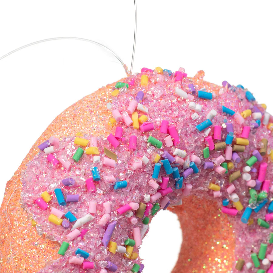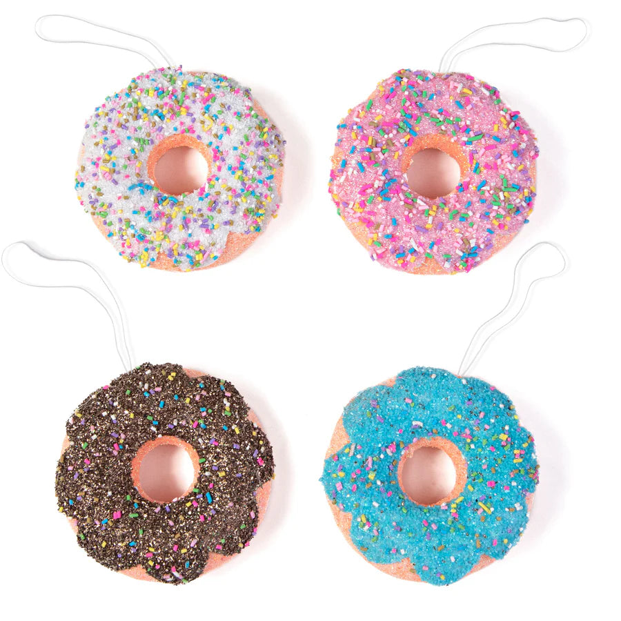 This set of life-sized donut ornaments matches our donut sprays. Each one is molded from lightweight foam, coated in glitter, and has a different topping - chocolate, glaze, blue icing and pink icing. Multi-color sprinkles finish off the pastry look.