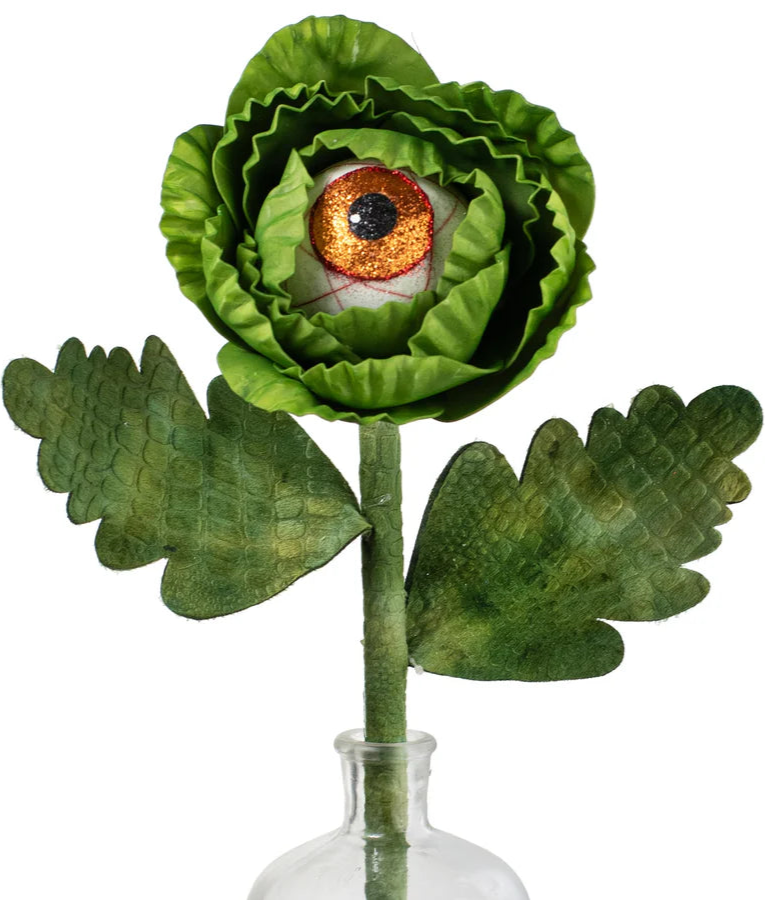 This flower decoration features a large human eyeball surrounded by a glittery foam eye with an orange iris and black pupil. The alligator skin-embossed velvet leaves and thickened wired stem add to its creepy appearance. Flower size is 6.5" in diameter, eyeball alone is 3.25" in diameter, leaves are 7.5" long, and stem is 0.5" in diameter.