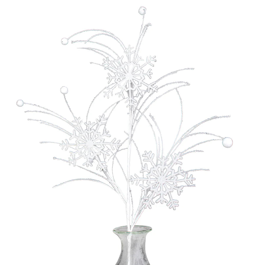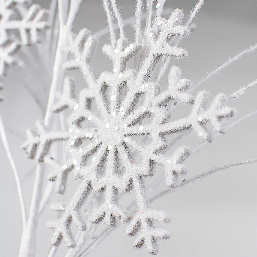 Elevate your holiday decor with our 28" Flocked Snowflake Spray. The three die cut poly foam snowflakes are coated with white flocking for a snowy look, while snowy grasses and glitter add a touch of blustery sparkle. The wired stem is wrapped in white paper, making it easy to position.