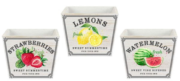 Use these marvelous fresh fruit planters to enhance your seasonal decor! These planters feature either detailed watermelons, lemons or strawberries, allowing them to mix perfectly with your floral decor, like bushes, creative sprays and picks! These planters will look marvelous in a stacked planter display, or even used on a ledge or mantle!