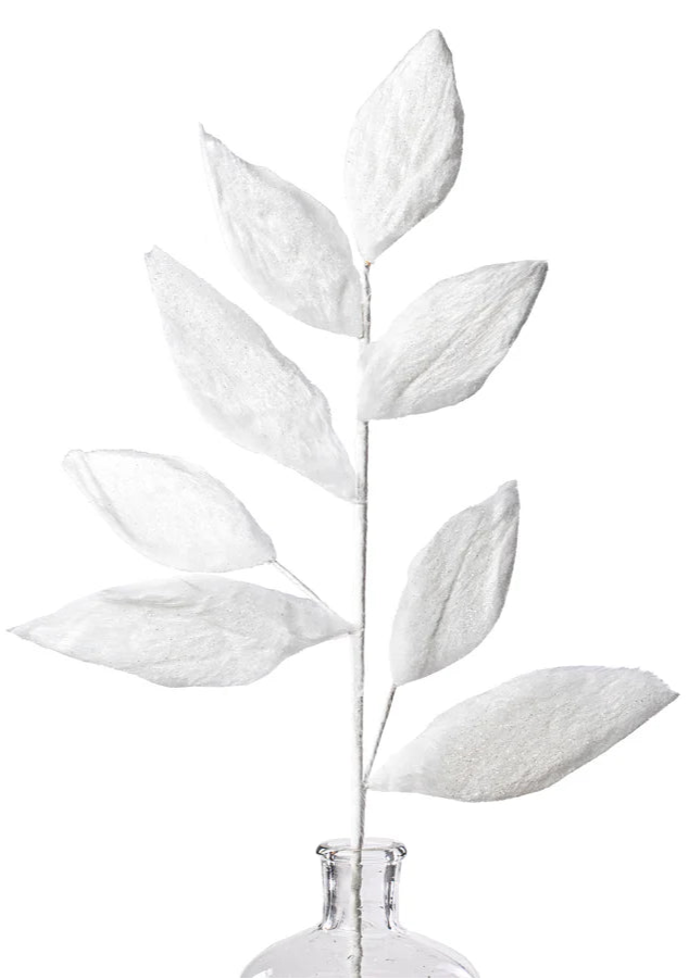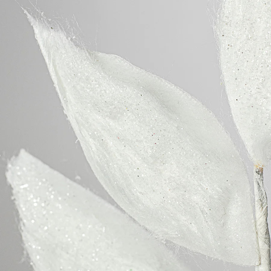 Enhance home decor with 26" White Faux Fur Leaf Spray. Features 8 wired leaves crafted from luxurious faux fur, sparkles with clear glitter. Stands at 15" tall and coordinates with white fur poinsettia. Available in 4.5" and 6.5" sizes, stems are wired and wrapped in white paper. Elevate space with this stunning spray.