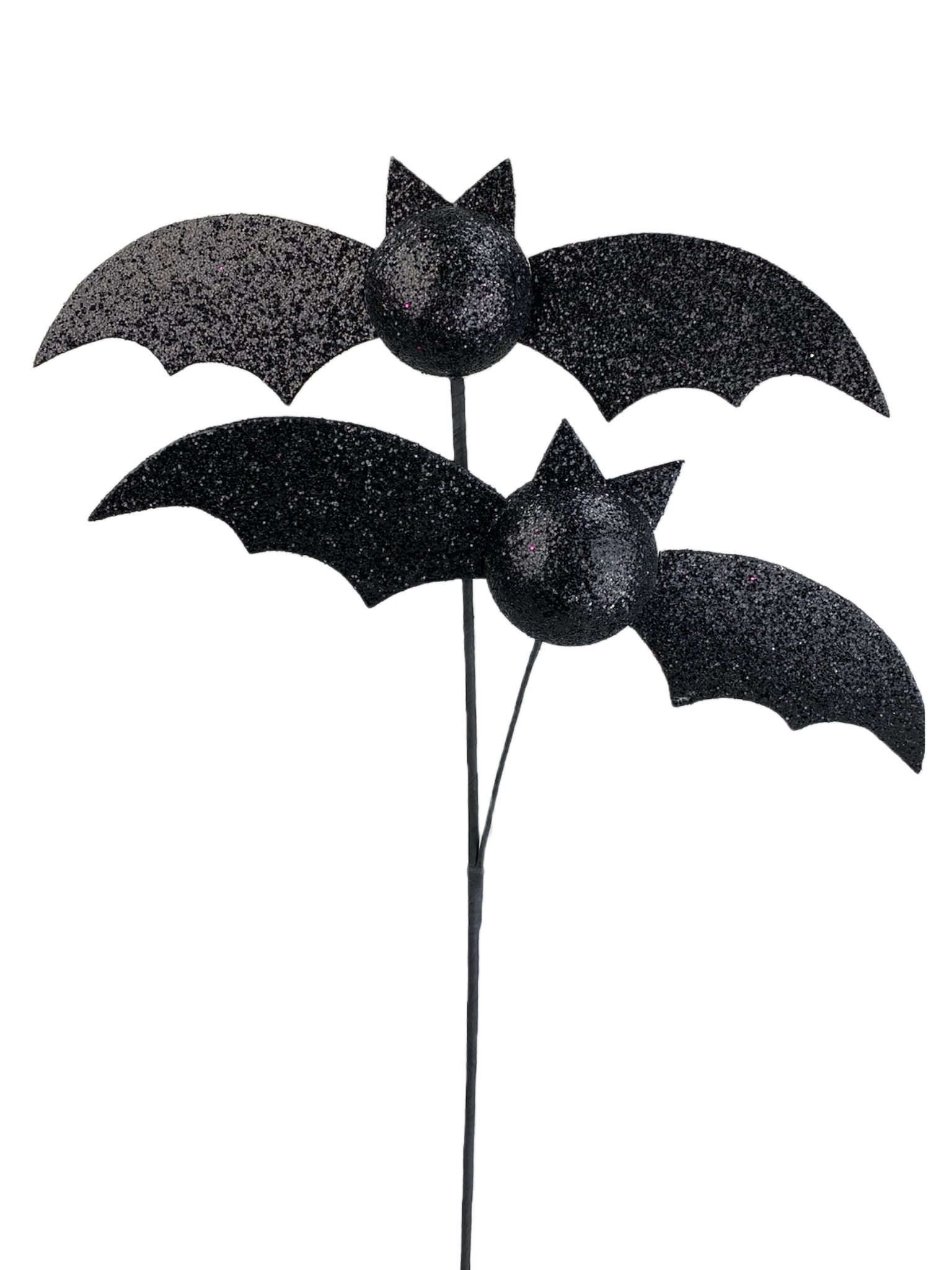 Enhance your Halloween decorations with our 25" Glitter Bat Spray. Featuring two large, heavily glittered black bats, each with a wingspan of 13 inches and a 3 inch body. Perfect for adding a spooky touch to wreaths and other decor.