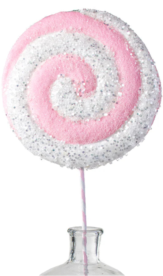 Introducing our 26" Pink & White Lollipop Pick - the perfect addition to any large space or event. The styrofoam base features swirls of white and light pink, coated in glitter and faux ice crystals. Its 8" diameter and wired stem wrapped in white paper and pink ribbon make it easy to use and a focal point in any setting.