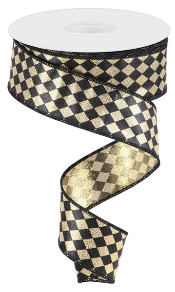 Add this marvelous harlequin metallic ribbon to any display you see fit! It's wired edge and eye-catching metallic gold and black harlequin pattern make it an adaptable addition to any decorative piece of your choosing.