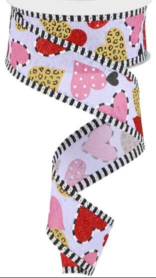 Fall in love with this multi pattern hearts/stripe on faux royal burlap ribbon! This ribbon features a striped folded fabric wired edge, plus a variety of heart patterns ranging from polka-dots, glitter, solid, and animal print atop a lavender base. Use this ribbon in designing your own custom wreath, and let it take on a Valentine's Day theme!