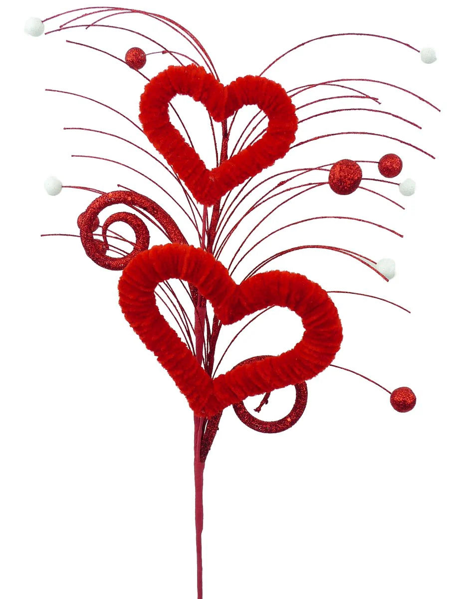27" Open Heart Curl Spray with red chenille covered hearts and glittery curls and balls. Pretty accent to add to Valentine's wreaths, trees, centerpieces, etc. Pull off each stem and use separately, or use as one full piece.