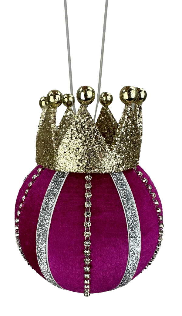This unique ornament is the perfect combination of festive colors and elegant design. Add a regal touch to your holiday and Mardi Gras decorations with our 7"H x 5'' Dia Crown Ball Ornament in Purple or Pink and Gold