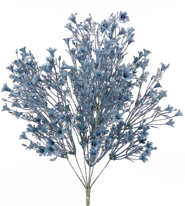 This 18" Plastic Wax Flower Bush features small light blue flowers that add beauty and texture to any wreath, garland, or floral arrangement. With separate stems, it offers versatile use for a variety of projects. A perfect addition to your crafting supplies.